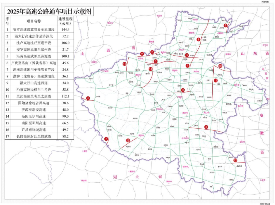 3.安罗高速豫冀省界至原阳段。全长144.359公里,双向六车道,设计时速120公里/小时。此段北通京津冀城市群和雄安新区,南联长江中游城市群,是贯穿我省中部的又一条交通脊梁,对缓解京港澳高速压力、加快郑州国家中心城市现代化建设意义重大。